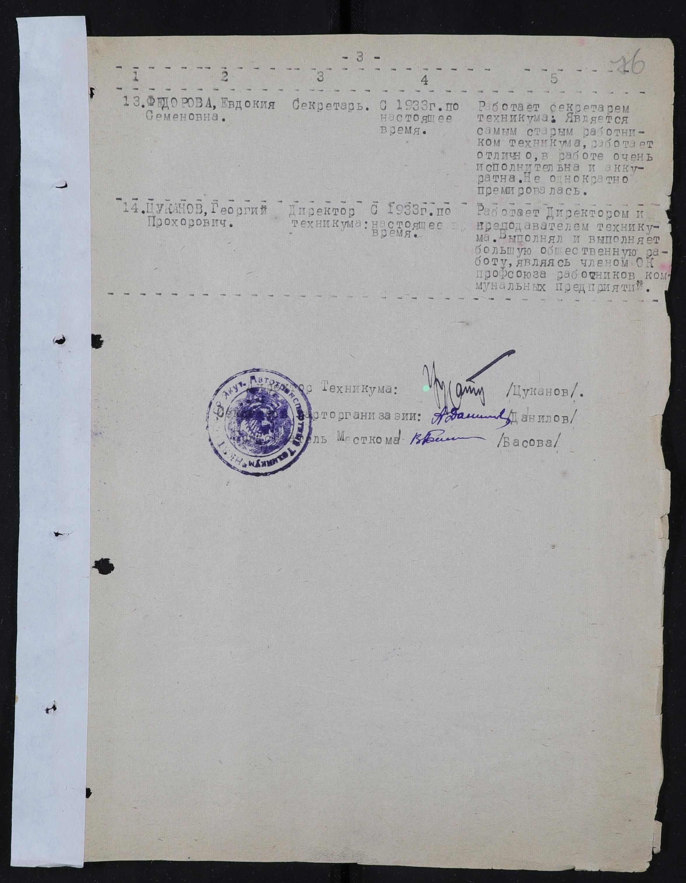 Характеристика: Работает директором и преподавателем техникума. Выполнял и выполняет большую общественную работу, являясь членом ОК профсоюза работников коммунальных предприятий.
