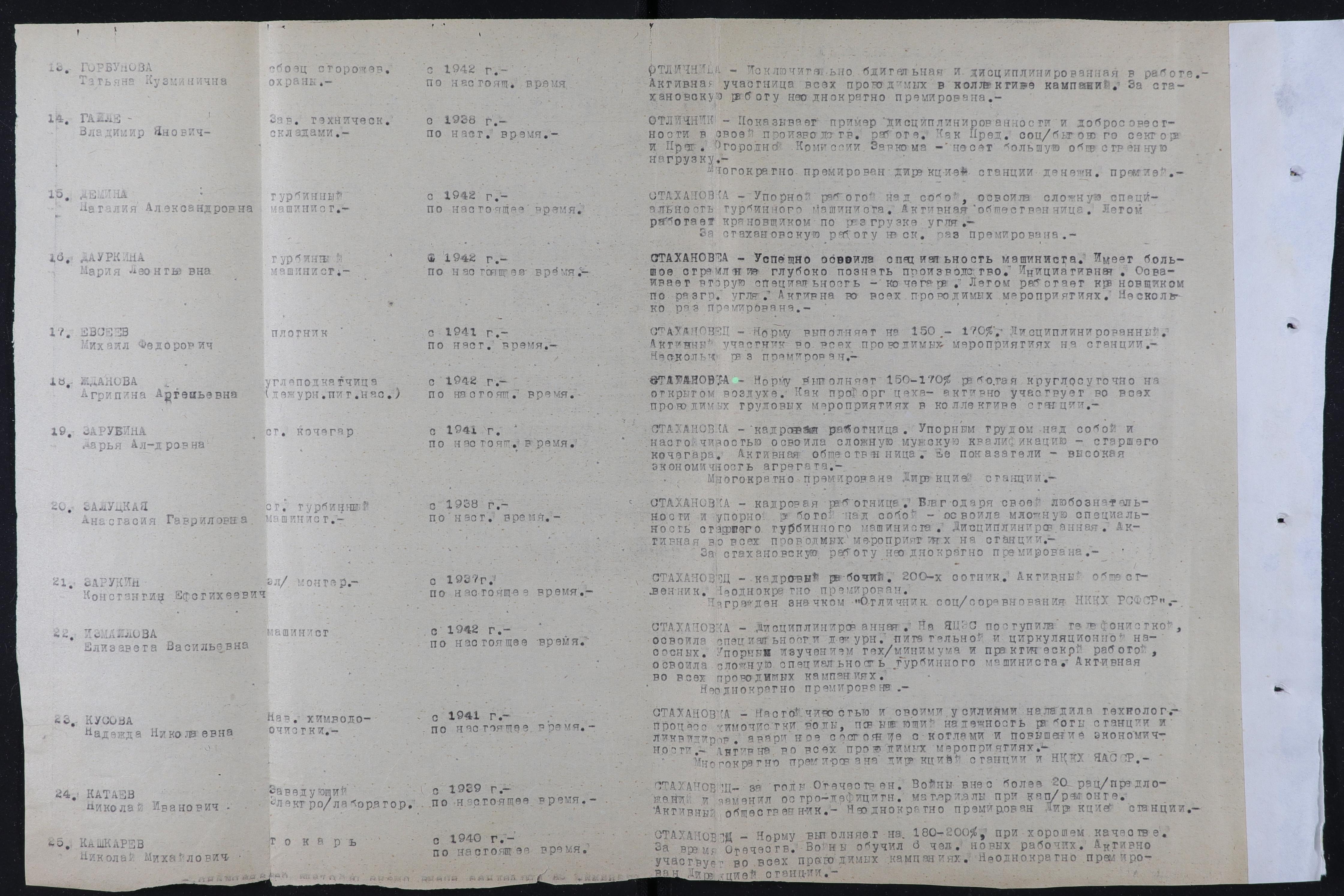 Характеристика: Стахановка. Успешно освоила специальность машиниста. Имеет большое стремление глубоко познать производство. Инициативная. Осваивает вторую специальность - кочегар. Летом работает крановщиком по разгрузке угля. Активна во всех проводимых мероприятиях. Несколько раз премирована.