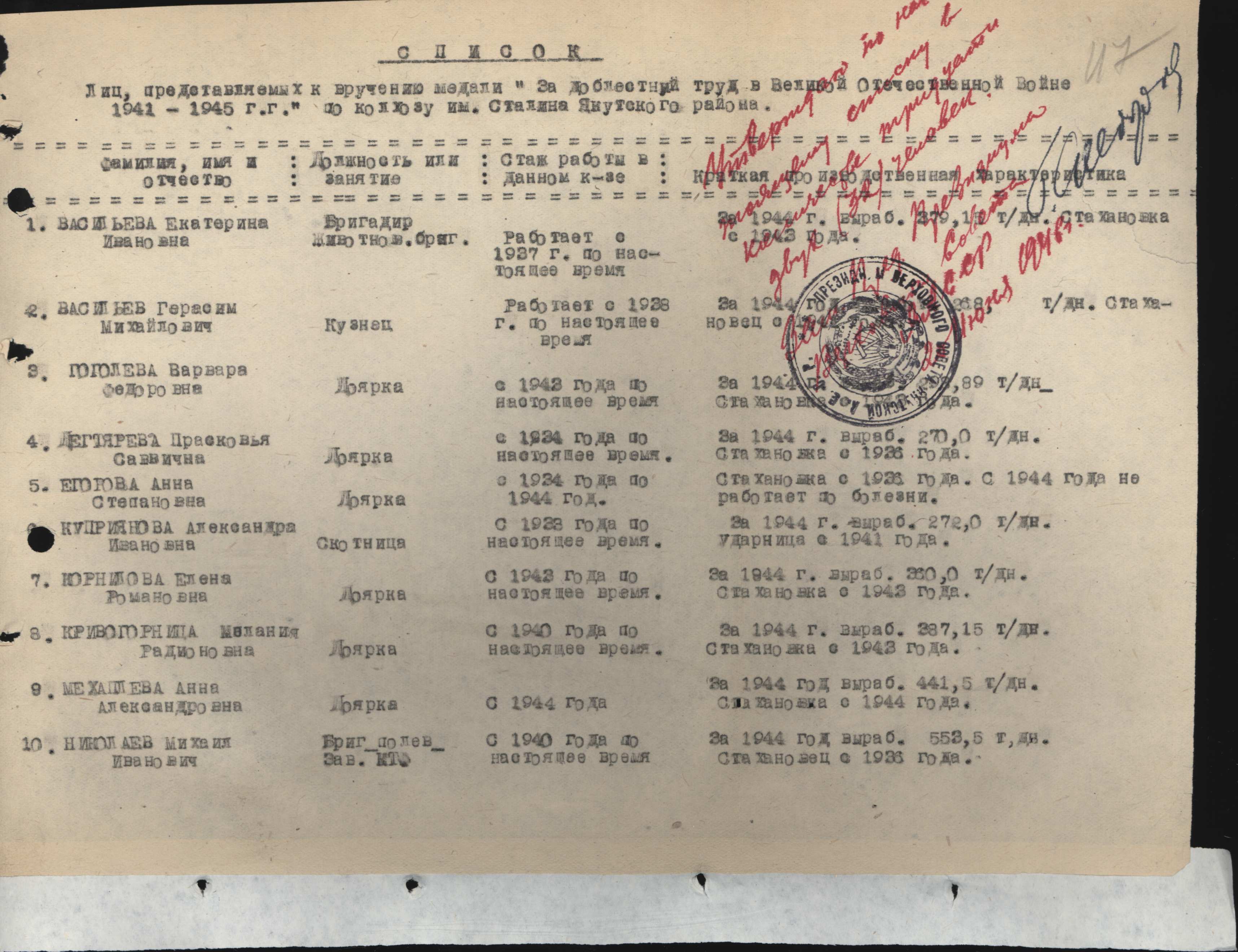 Характеристика: За 1944 год выраб 270,0 т/дней. Стахановка с 1926 года