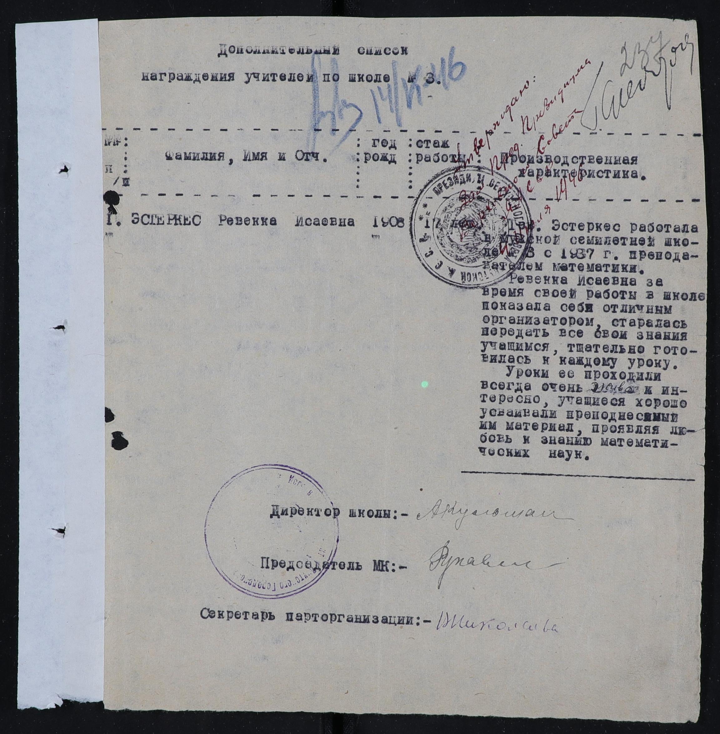 Характеристика: Работала в мужской семилетней школе с 1937г. Преподавателем математики. За время своей работы в школе показала себя отличным организатором, старалась передать все свои знания учащимся, тщательно гоовилась к каждому уроку. Уроки ее проходили всегда очень живо и интересно, учащиеся хорошо усваивали преподносимый им материал, проявляя любовь и знания матем.наук.