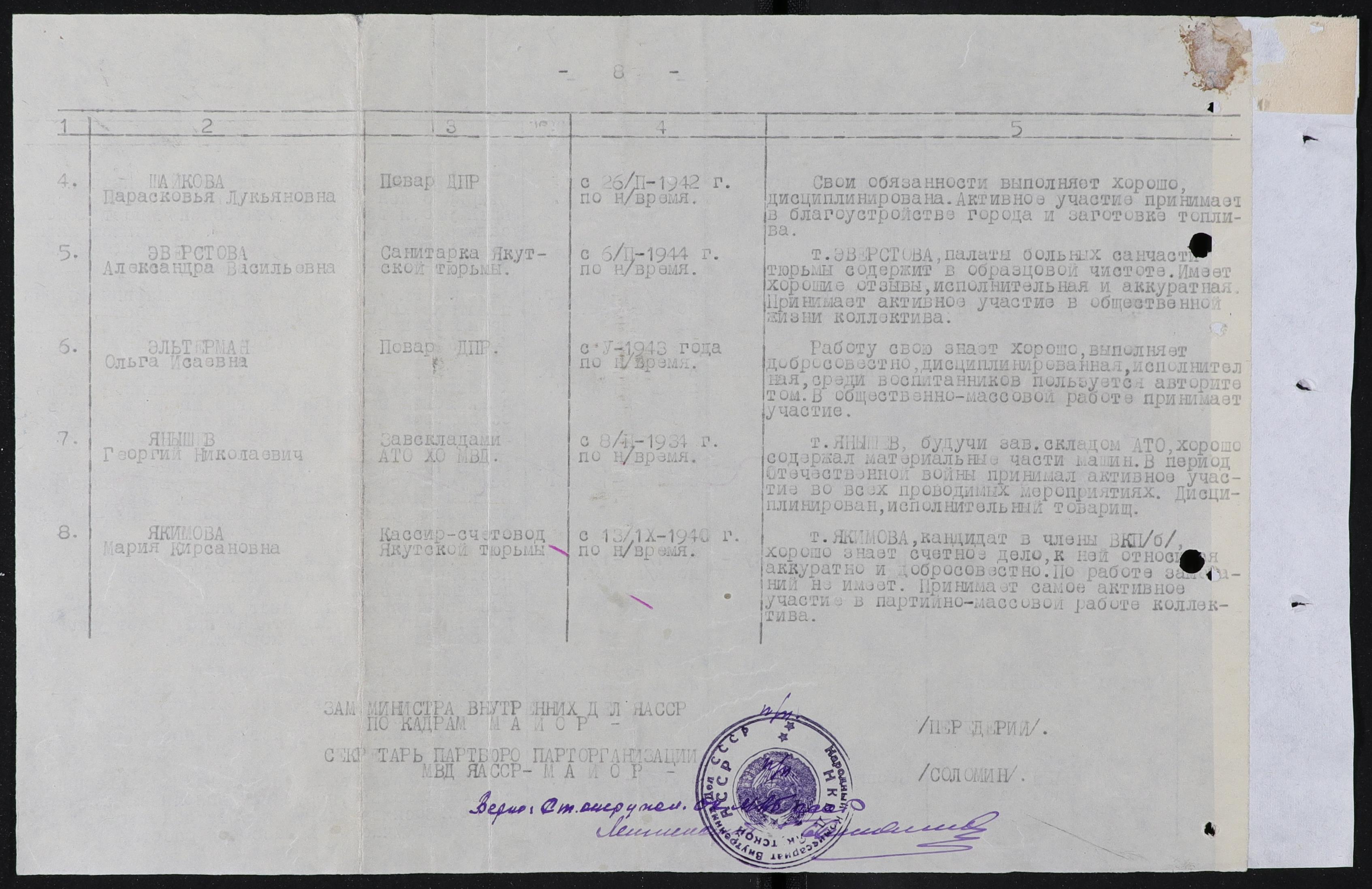 Характеристика: Т. Эверстова, палаты больных санчасти тюрьмы содержит в образцовой чистоте, имеет хорошие отзывы, исполнительная и аккуратная. Принимает активное участие в общественной жизни коллектива.