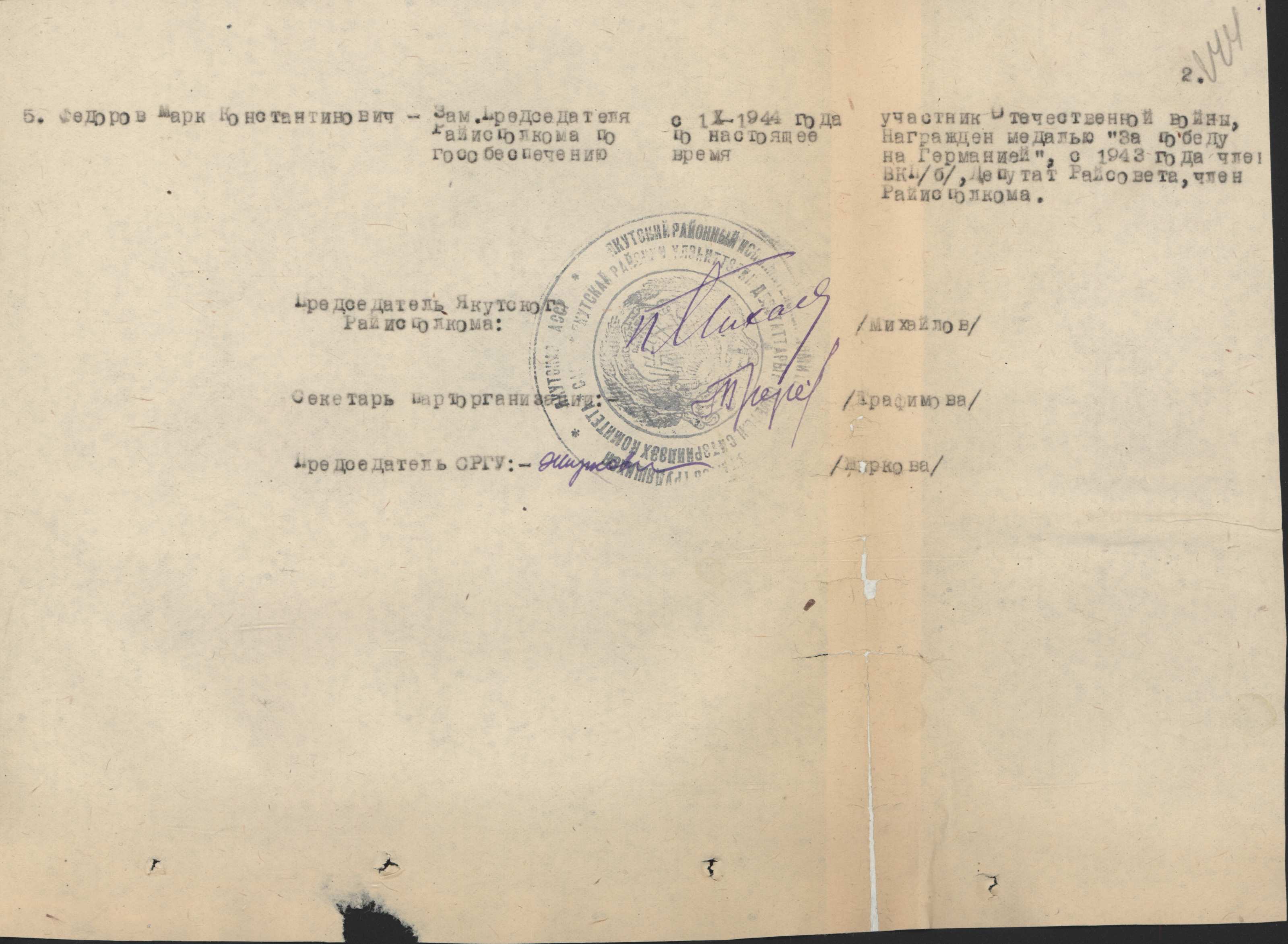 Характеристика: Участник ВОВ, награжден Медалью «За победу над германией», с 1943 года член Якутский обком ВКП (б), Депутат Райсовета, член Райисполкома.