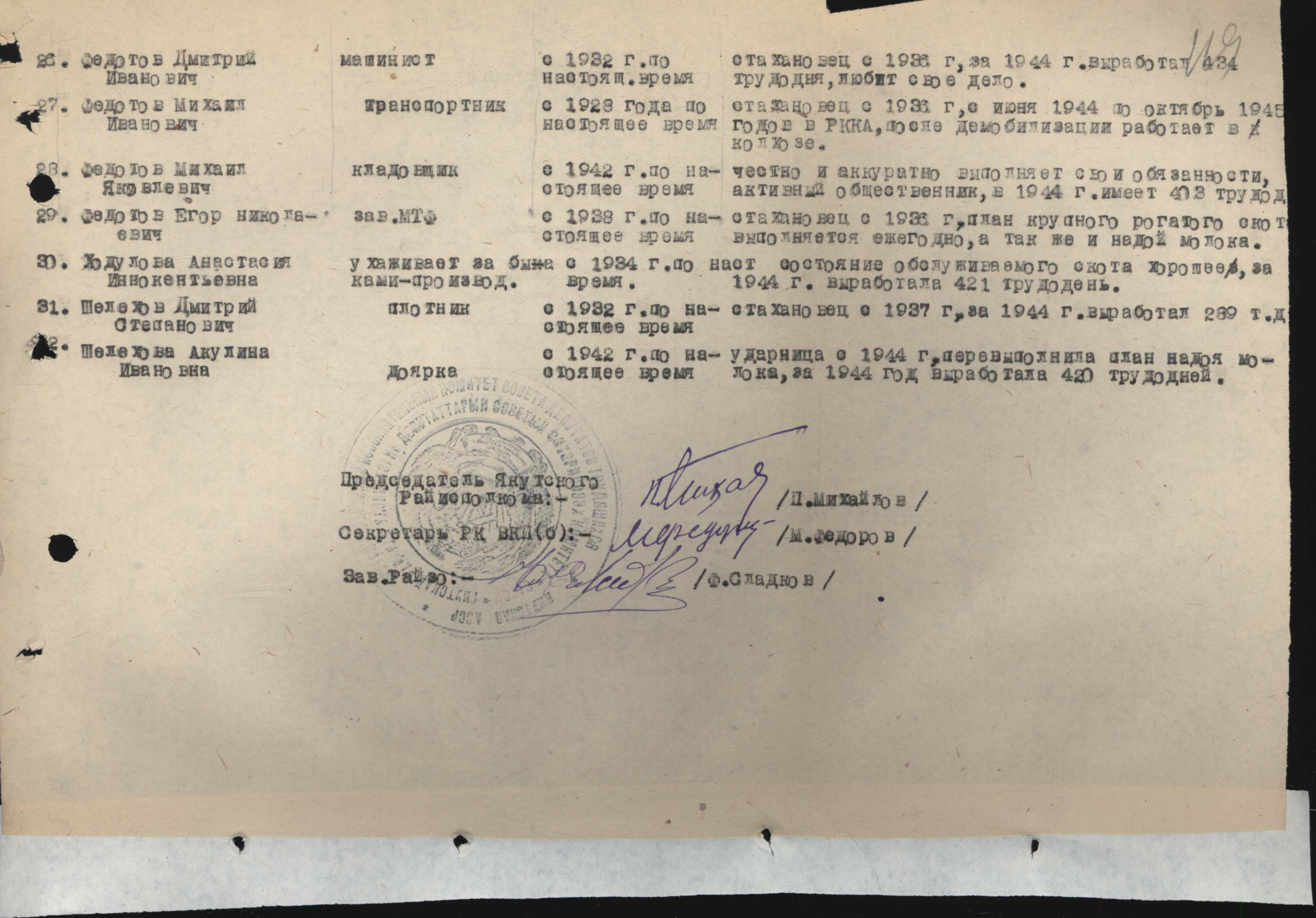 Характеристика: Стахановец с 1936 г, за 1944 г выработал 434 т/дн. Любит свое дело.