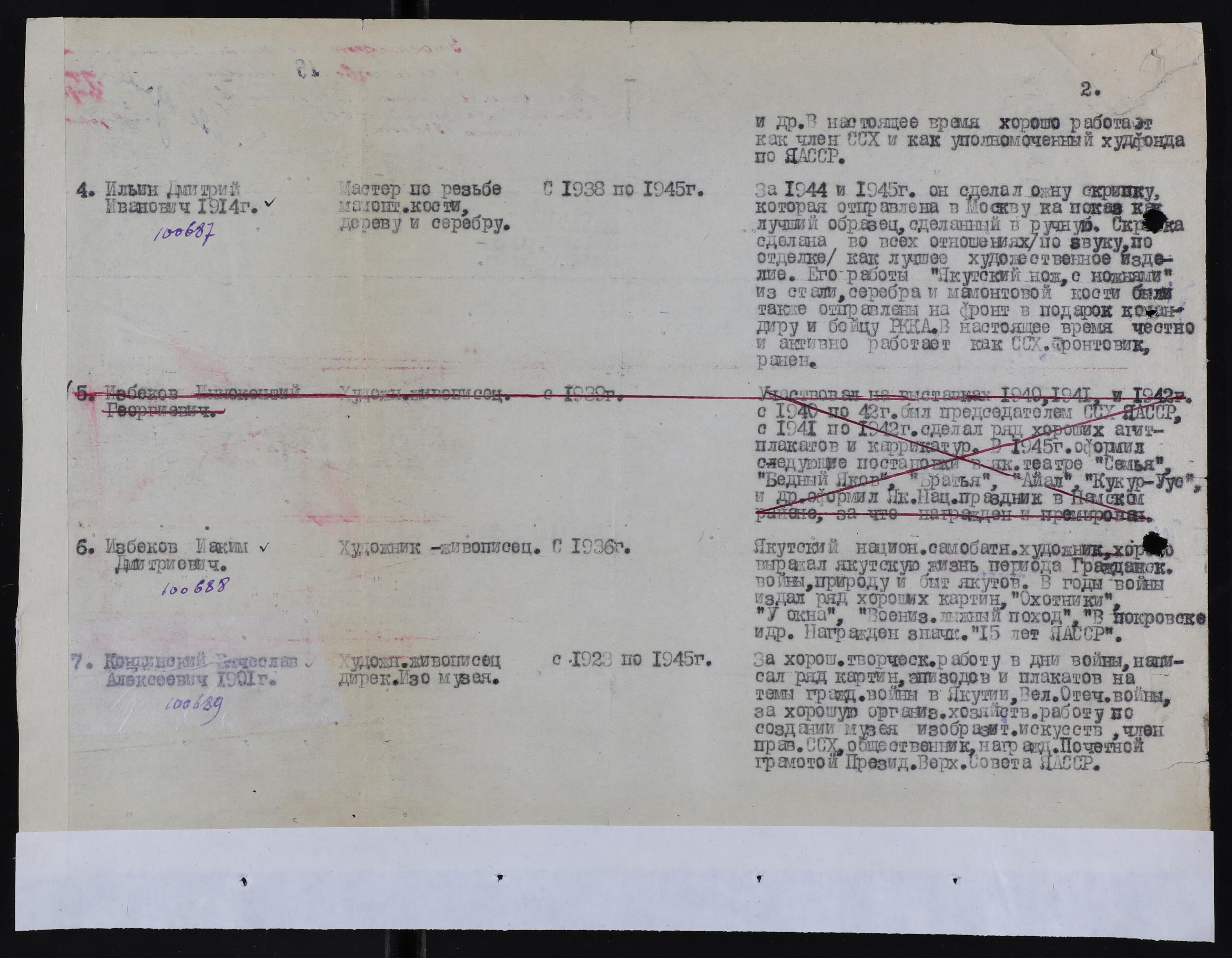 Характеристика: За 1944 и 1945гг. Он сделал одну скрипку, которая отправлена в Москву на показ как лучший образец, сделанный вручную. Скрипка сделана во всех отношениях (по звуку, по отделке) как лучшее художественное изделие. Его работы «Якутский нож, с ножнями» из стали, серебра и мамонтовой кости были также отправлены на фронт в подарок командиру и бойцу РККА. В настоящее время честно и активно работает как ССХ фронтовик, ранен.