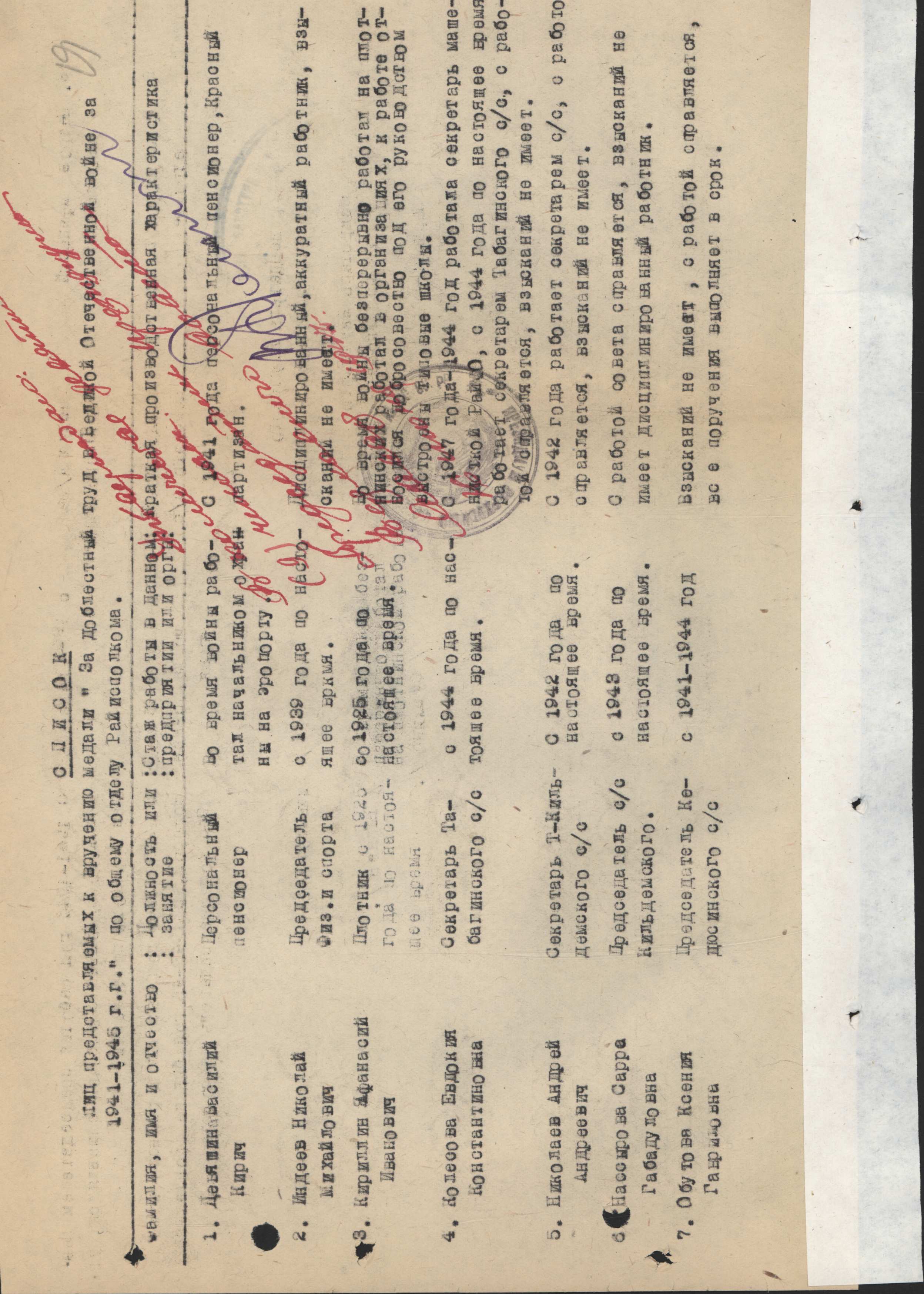 Характеристика: С 1944-1947 гг. работала секретарь машинисткой районо. С 1944 г по настоящее время работает секретарем Табагинского с/с, с работой справляется, взысканий не имеет.