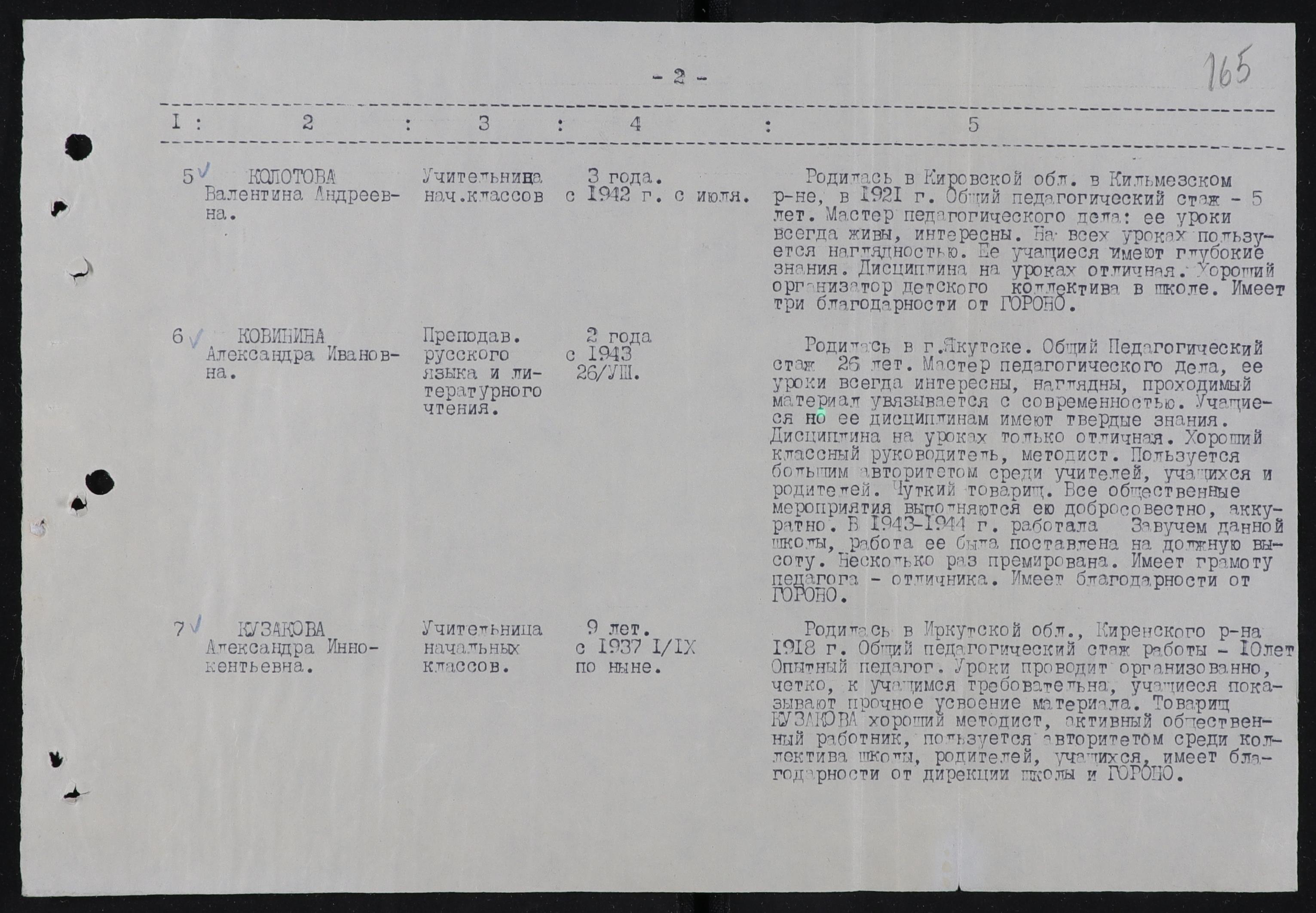 Характеристика: Родилась в Кировской области в Кильземском районе, в 1921г. Общий педстаж - 5 лет Мастер пед-го дела: ее уроки всегда живы, интересны. На всех уроках пользуется наглядностью. Ее уч-ся имеюг глубокие знания. Дисциплина на уроках отличная. Хороший организатор детского коллектива в школе. Имеет три благодарности от ГоОНО.