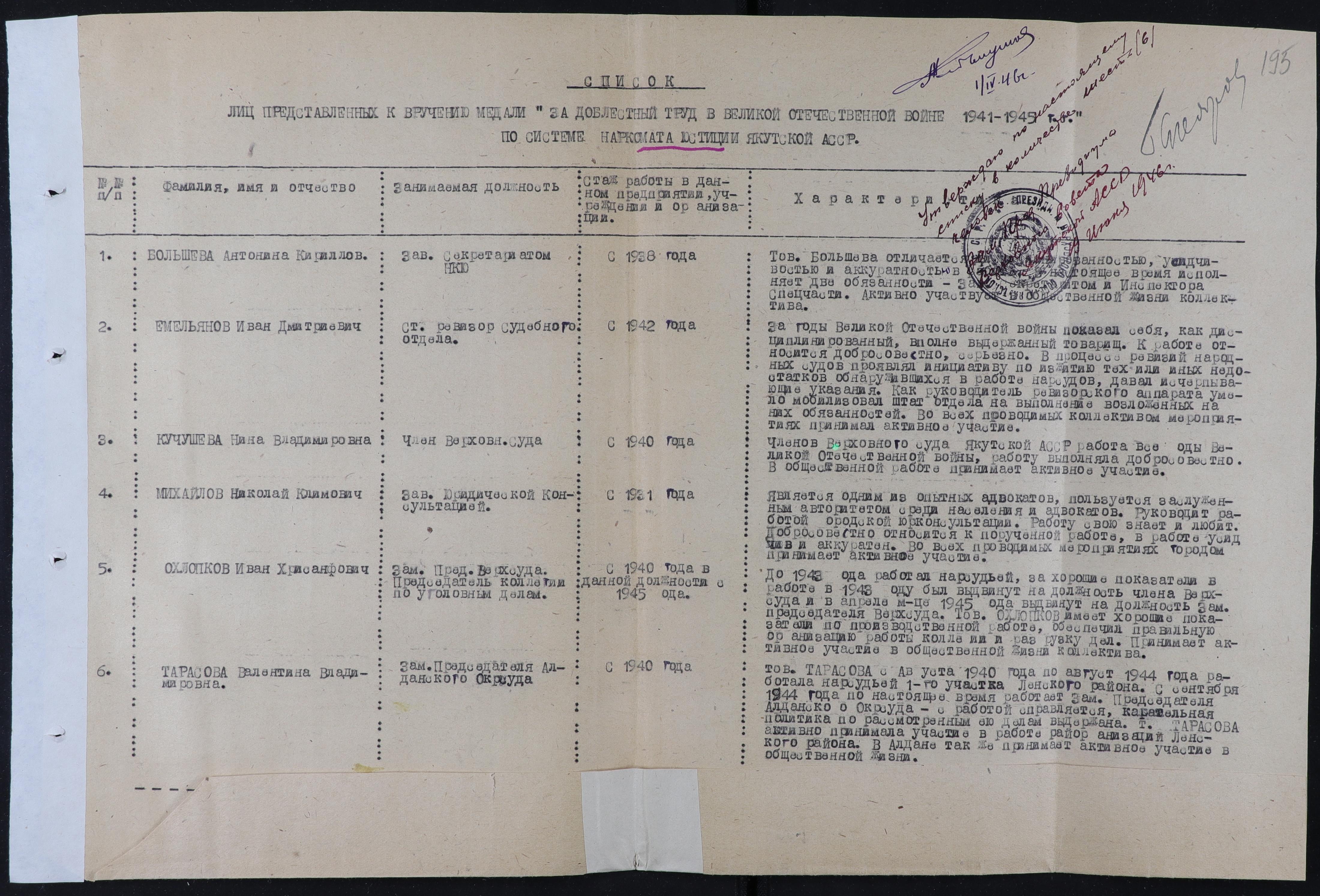 Характеристика: Членом Верховного суда Якутской АССР работала все годы ВОВ, работу выполняла добросовестно. В общественной работе принимала активное участие.