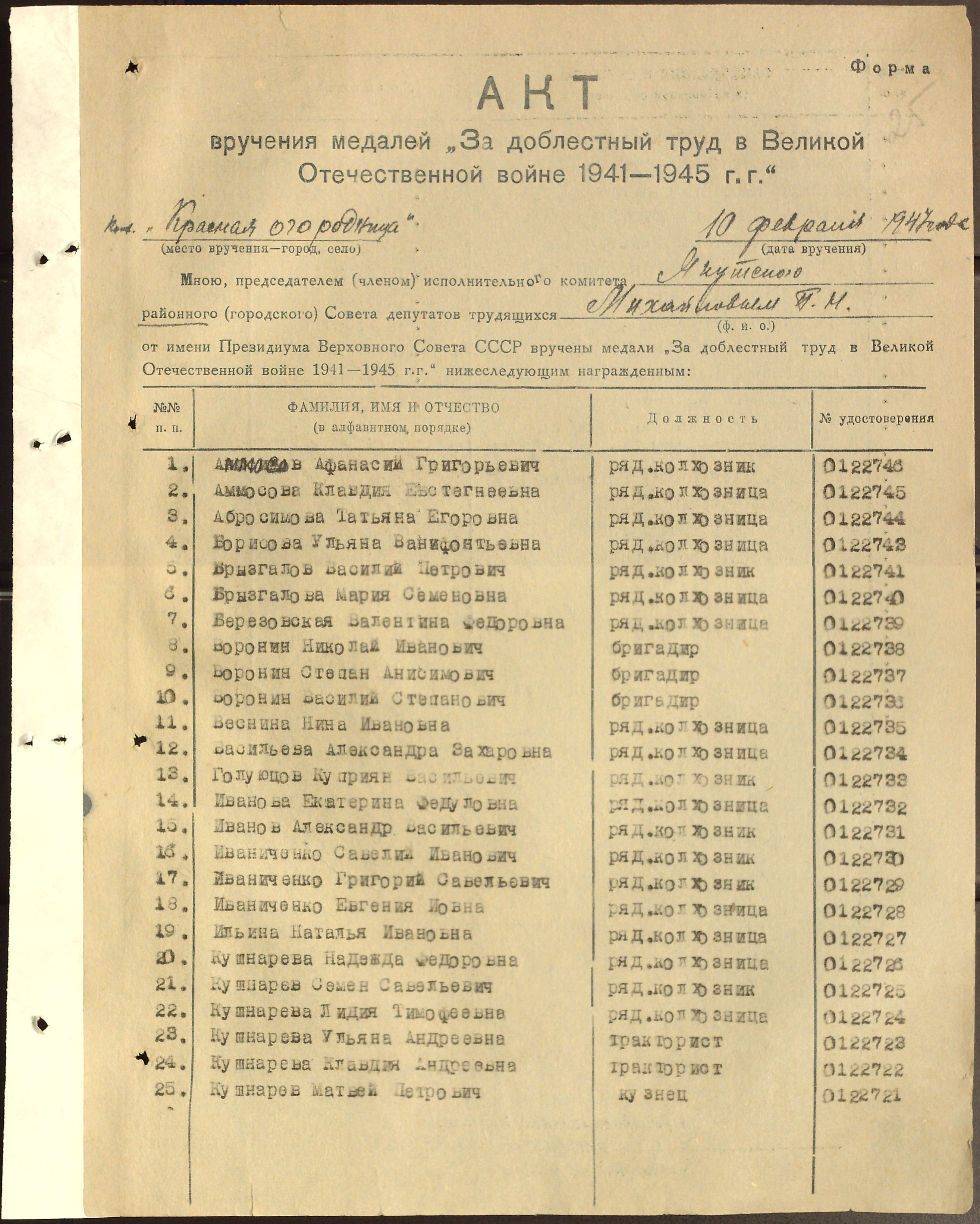 Место работы: Колхоз «Красная огородница»