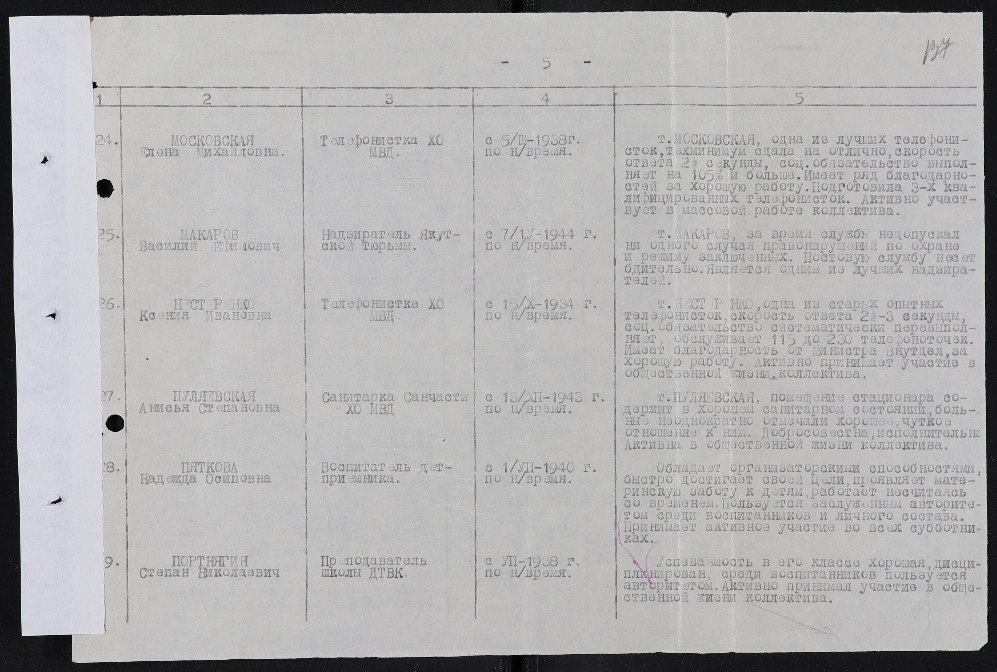 Характеристика: Т. Нестеренко, одна из старых, опытных телефонисток, скорость ответа 2-3 секунды, соц.обязательство систематически перевыполняет, обслуживает 115 до 230 телефонисточек. Имеет благодарность от Министра внутренних дел за хорошую работу, активно принимает участие в общественной жизни коллектива.