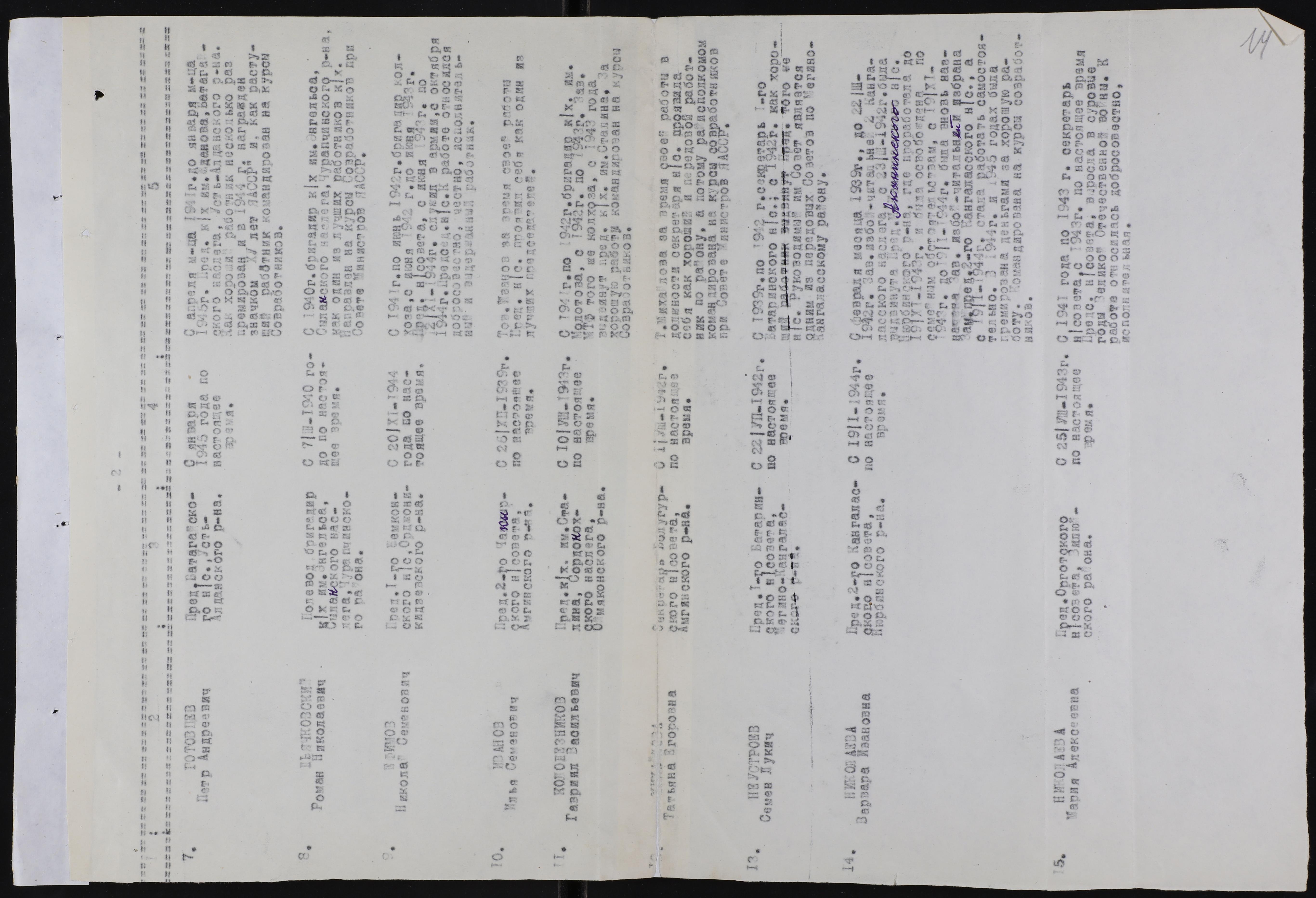 Характеристика: 1941-1943 гг. - секретарь н/совета, с 1943г. По наст.вр. - Предс.н/совета, выросла в суровый годы ВОВ, к работе относилась добросовестно, исполнительная.