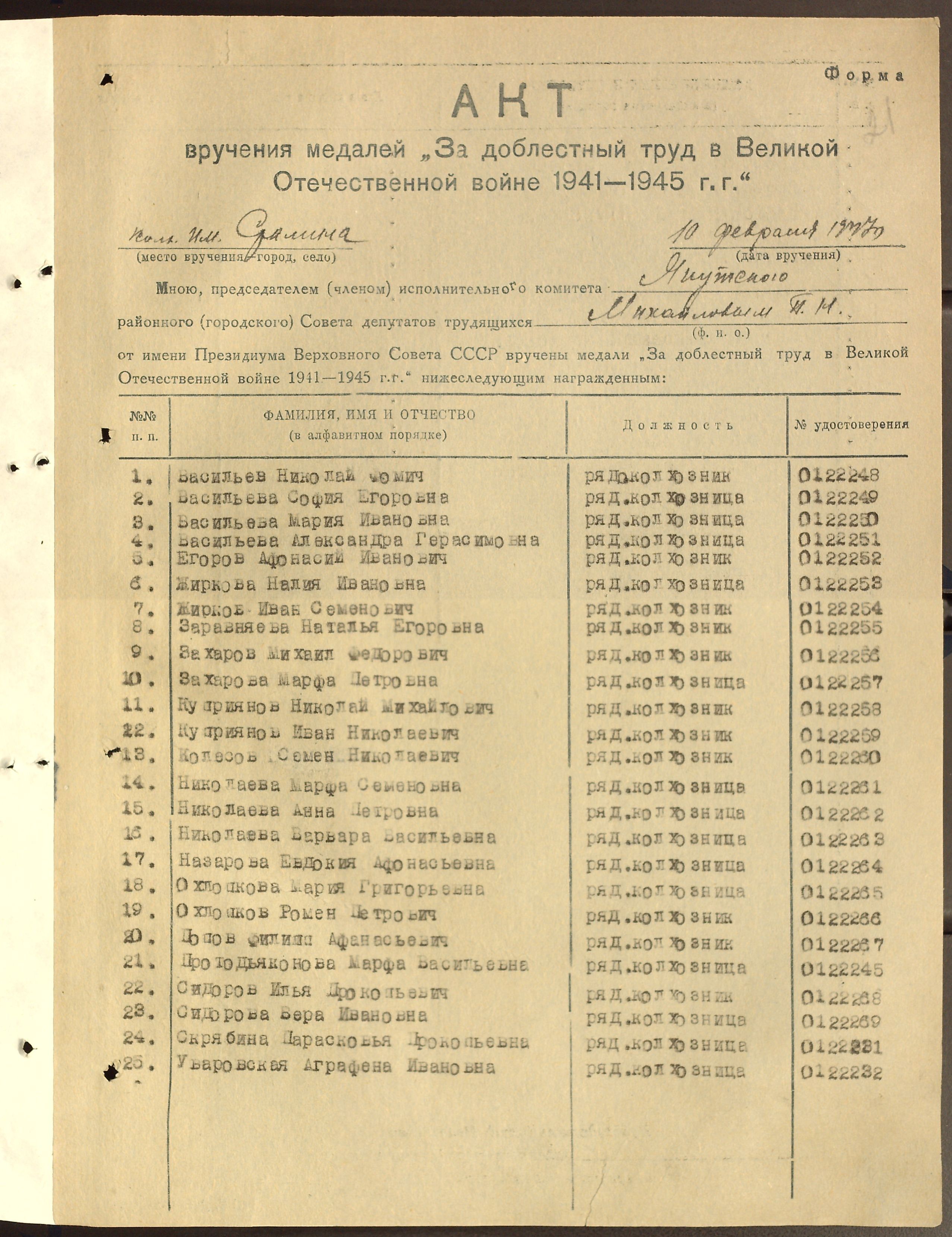 Место работы: Колхоз им. Сталина Т-Кильдямского с/совета