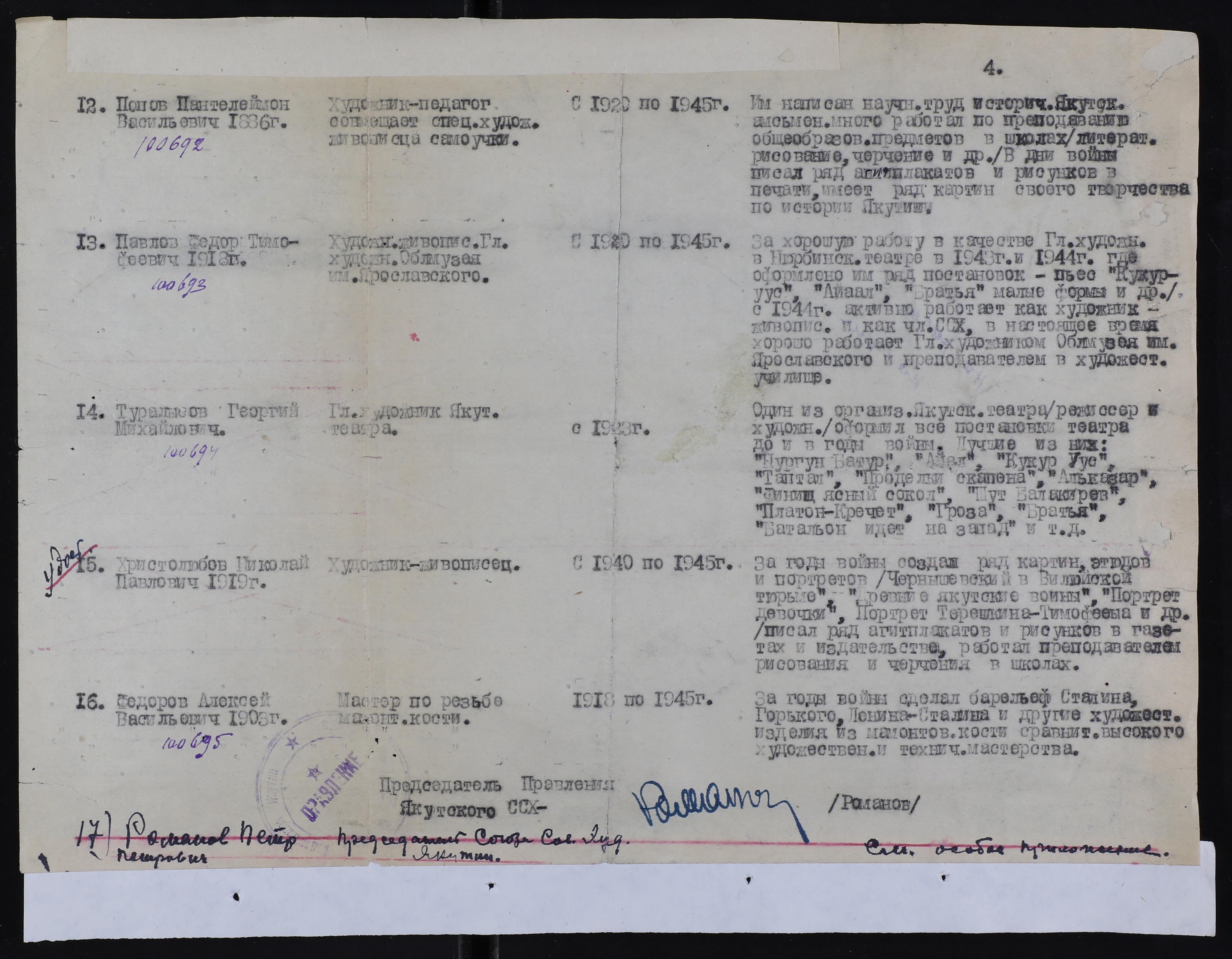 Характеристика: За хорошую работу в качестве Гл. художн. в Нюрбинск. Театре в 1943г. И 1944г. где оформлено им ряд постановок - пьес «Кукуруус», «Айаал», «Братья» мале формы и др./с 1944г. Активно работает как художник -живописец и как чл.ССХ, в настоящее время хорошо работает Гл.художником Обл.музея им. Ярославского и преподавателем в художест.училище.