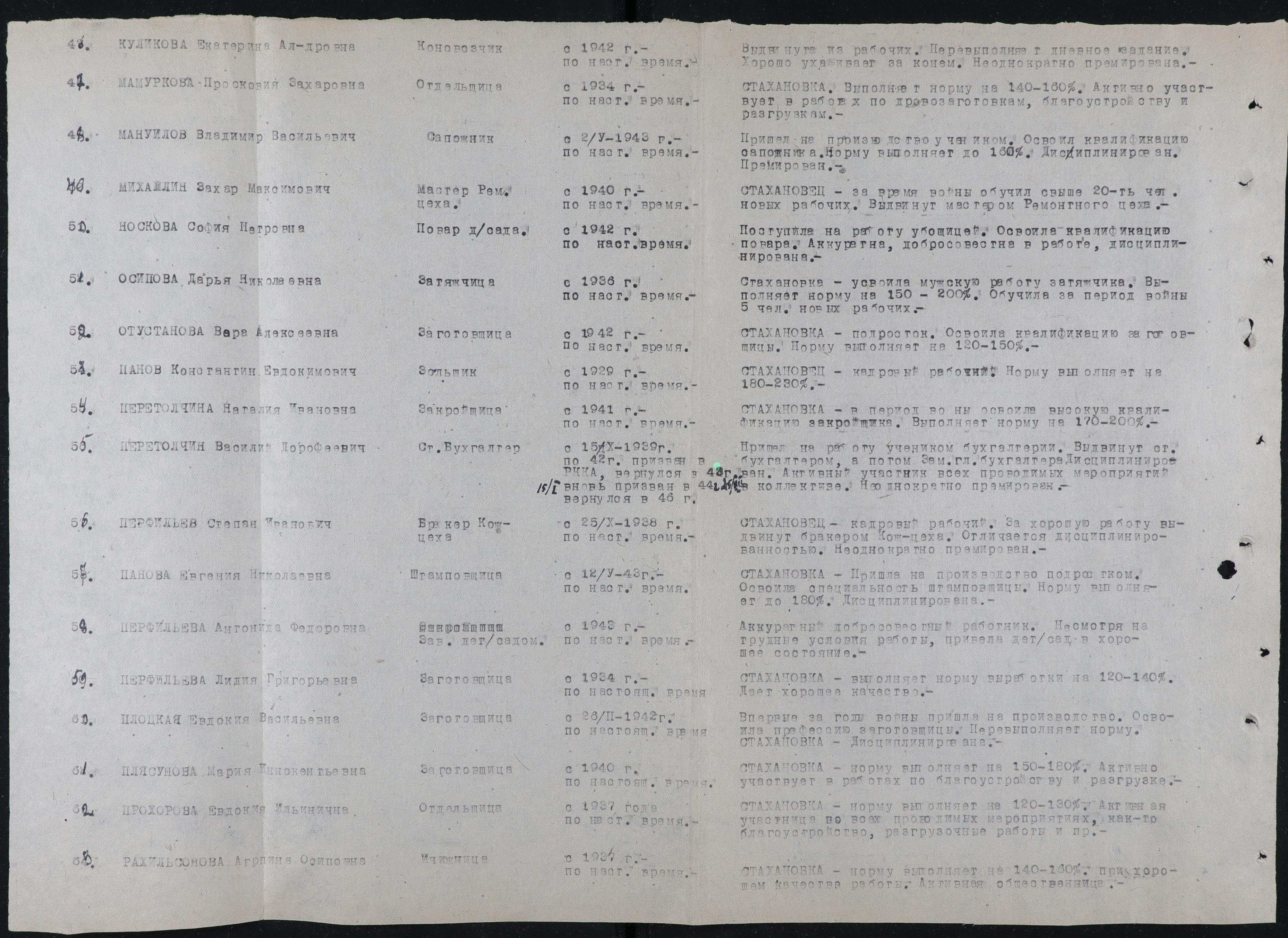 Характеристика: Стахановец - кадровый рабочий. За хорошую работу выдвинут бракером кож.цеха. Отличается дисциплинированностью. Неоднократно премирован.