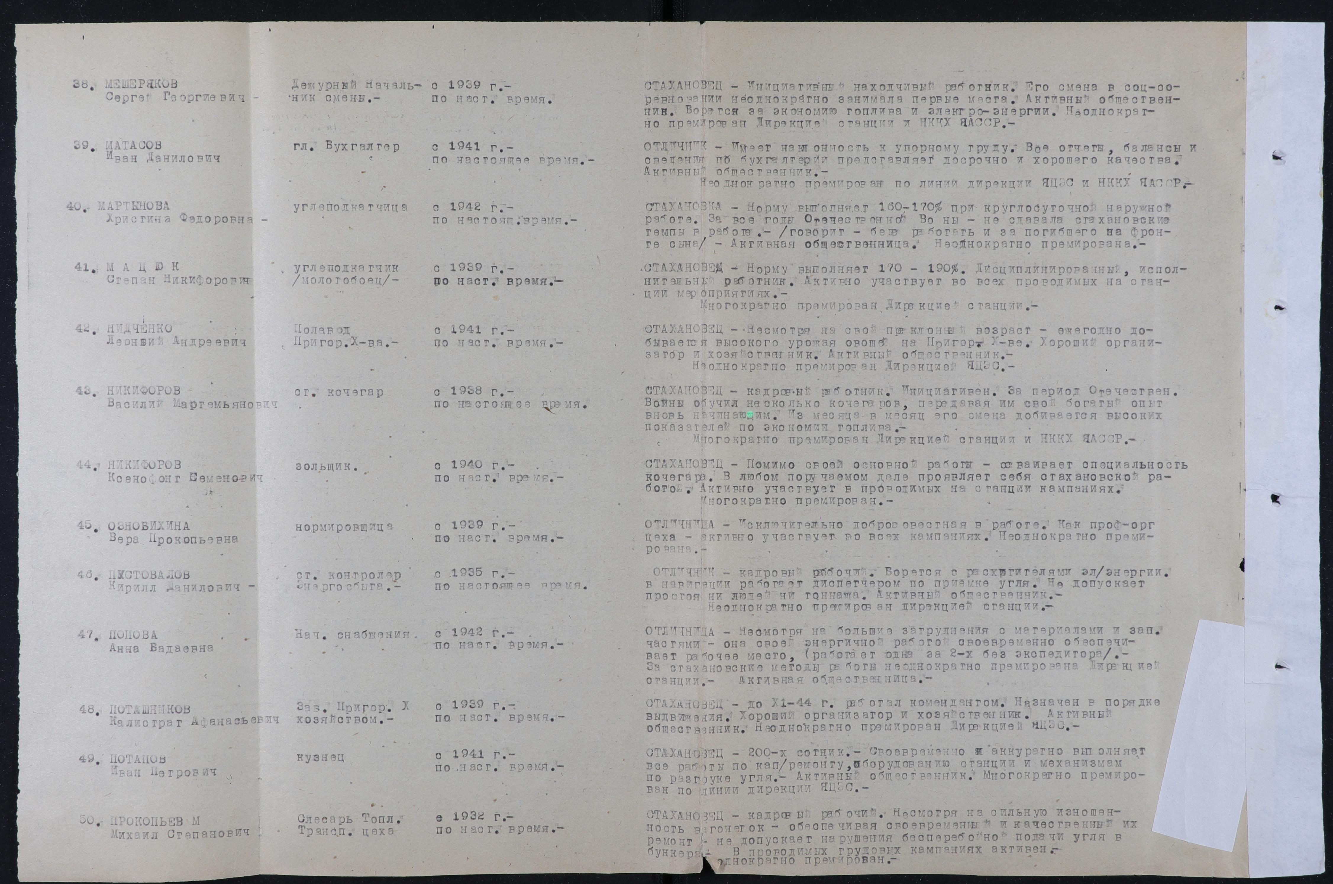 Характеристика: Стахановец - кадровый рабочий. Несмотря на сильную изношенность вагонеток - обеспечивая своевременный и качественный их ремонт, не допускает нарушения беспребойной подачи угля в бункерах. В проводимых трудовых кампаниях активен. Неоднократно премирован.