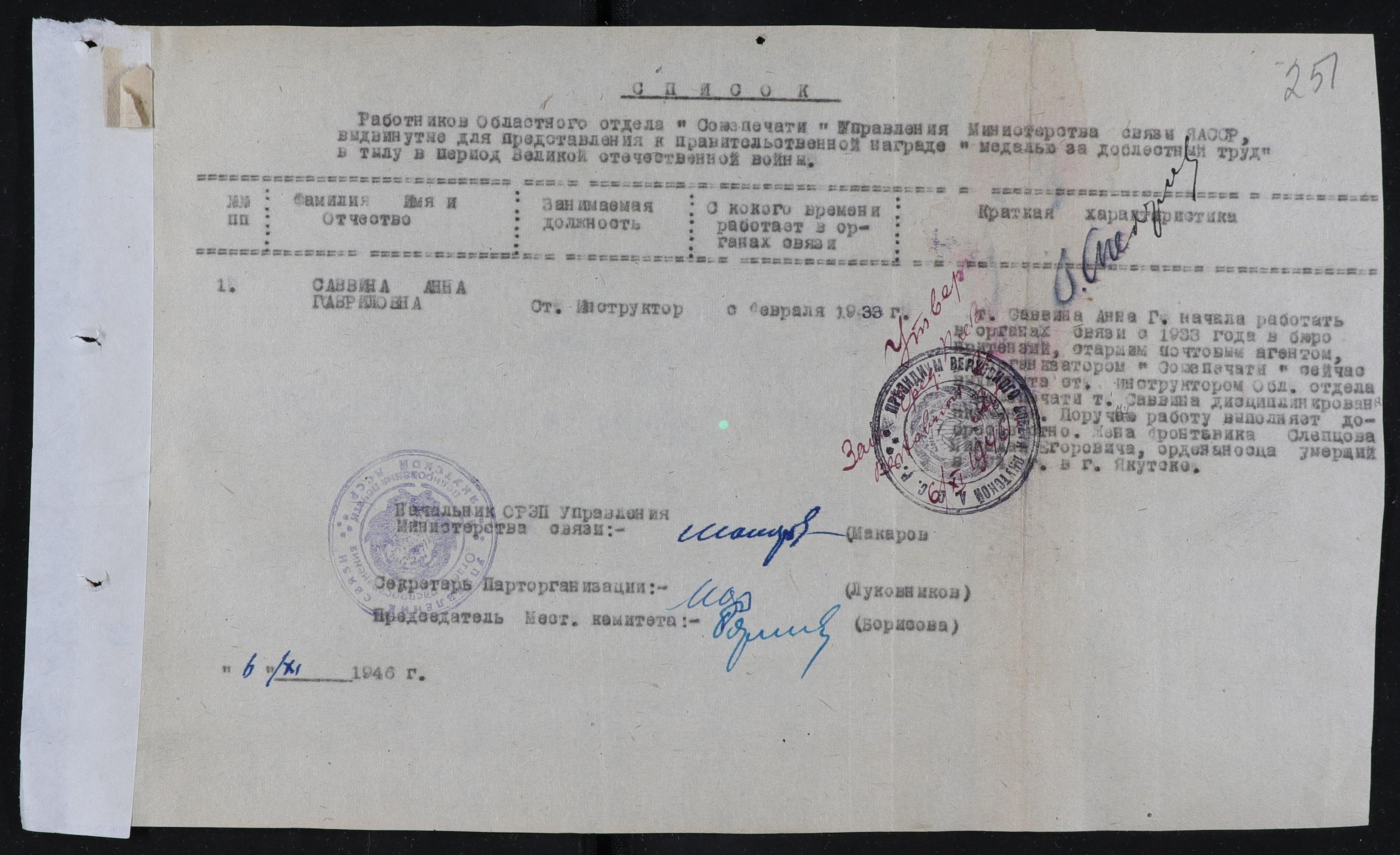 Характеристика: Начала работать в органах связи с 1933г. В бюро притензий, старшим почтовым агентом. Сейчас выдвинута ст.инструктором Обл. отдела Союзпечати. Дисциплинированна. Порученную работу выполняет добросовестно. Жена фронтовика - орденоносца, умершего в г. Якутске)
