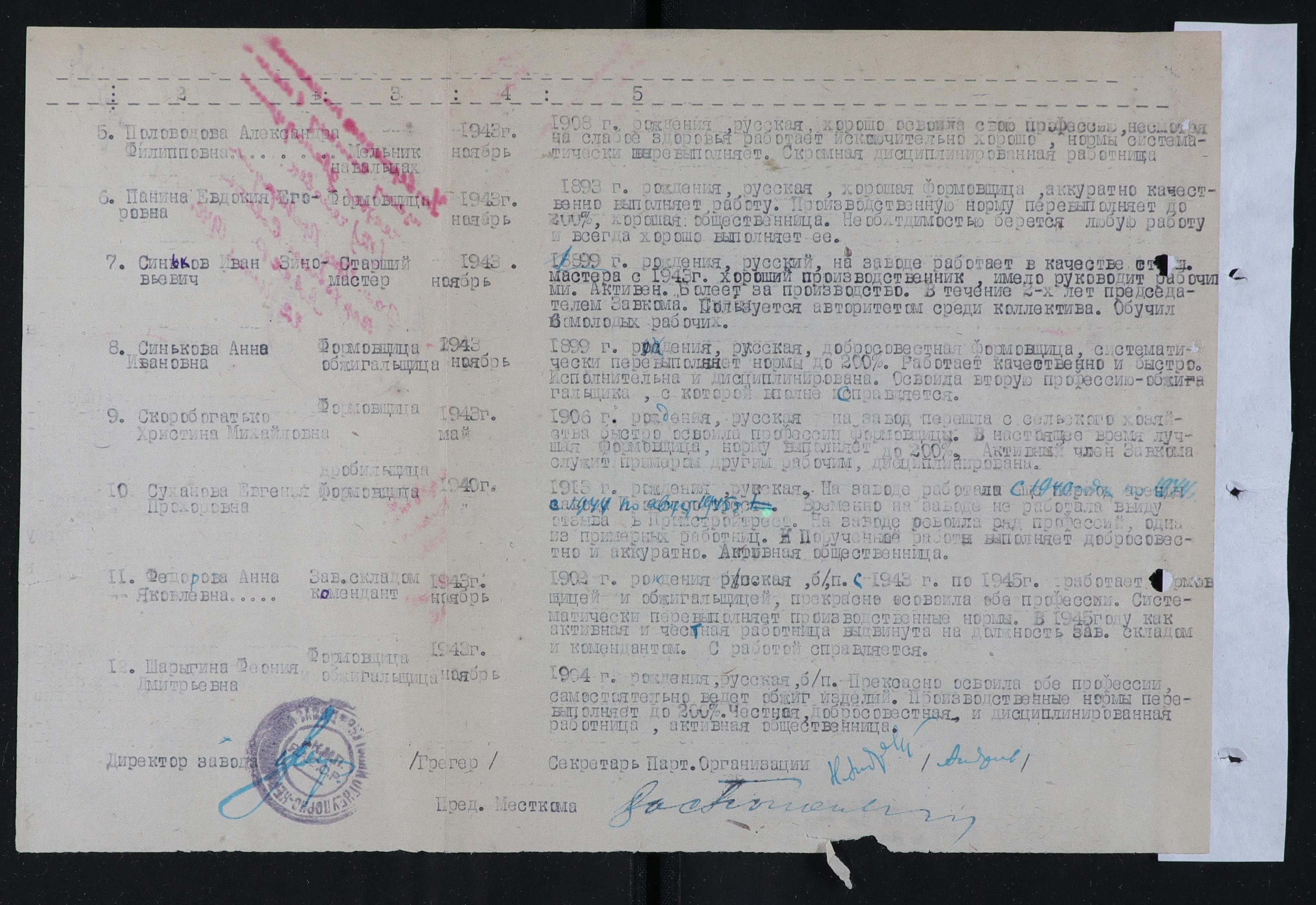 Характеристика: 1899 гр., русский, на заводе не работает в качестве ст. мастера с 1943г. Хороший производственник, умело руководит рабочими. Активен. Болеет за производство. В течении 2-х лет председателем Завкома. Пользуется авторитетом среди коллектива. Обучил 6 молодых рабочих.