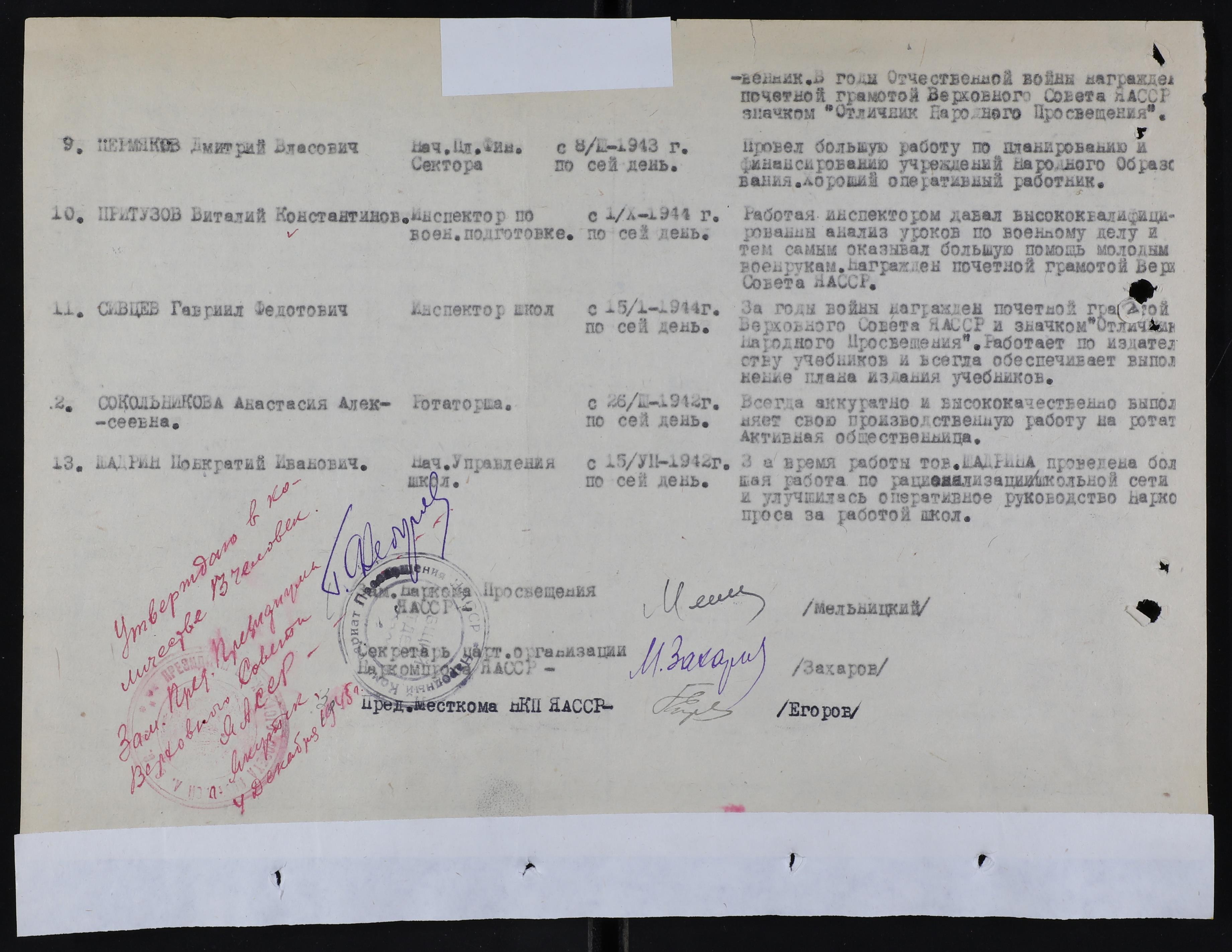 Характеристика: За годы ВОВ награжден почетной грамотой Верховного Совета ЯАССР и знаком «Отличник народного Просвещения». Работает по издательству учебников и всегда обеспечивает выполнение плана изданий учебников.