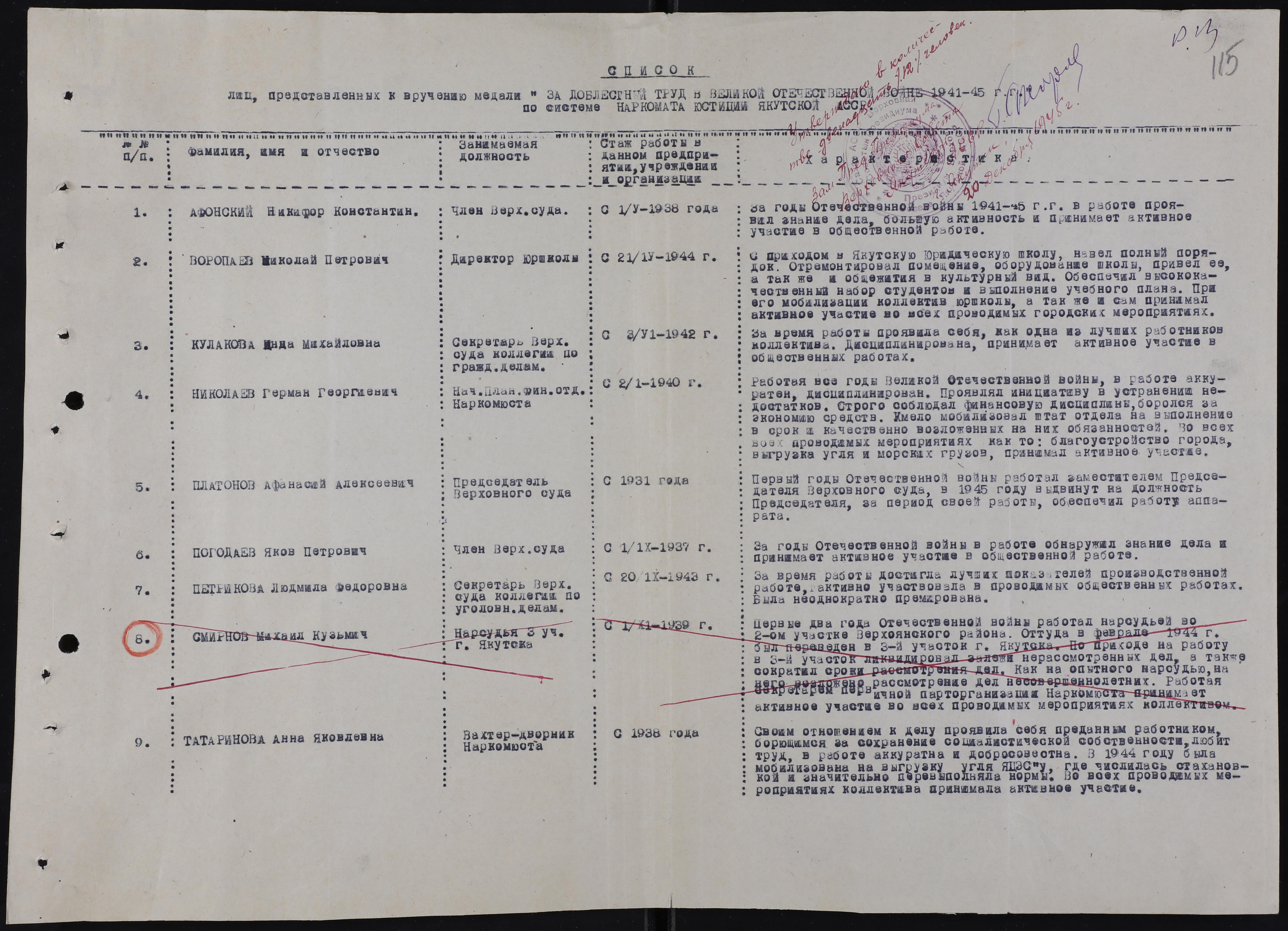Характеристика: Первые два года ВОВ работал нарсудьей во 2-ом участке Верхоянского района. Оттуда в феврале1944г. Был переведен в 3-й участок г. Якутска. По приходе на работу в 3-й участок ликвидировал залежи нерассмотренных дел, а также сократил сроки рассмотрения дел. Как на опытного нарсудью, на него возложено рассмотрение дел несовершеннолетних. Работая секретарем первичной парторганизации Наркомюста принимает активное участие во всех проводимых мероприятиях коллективом.