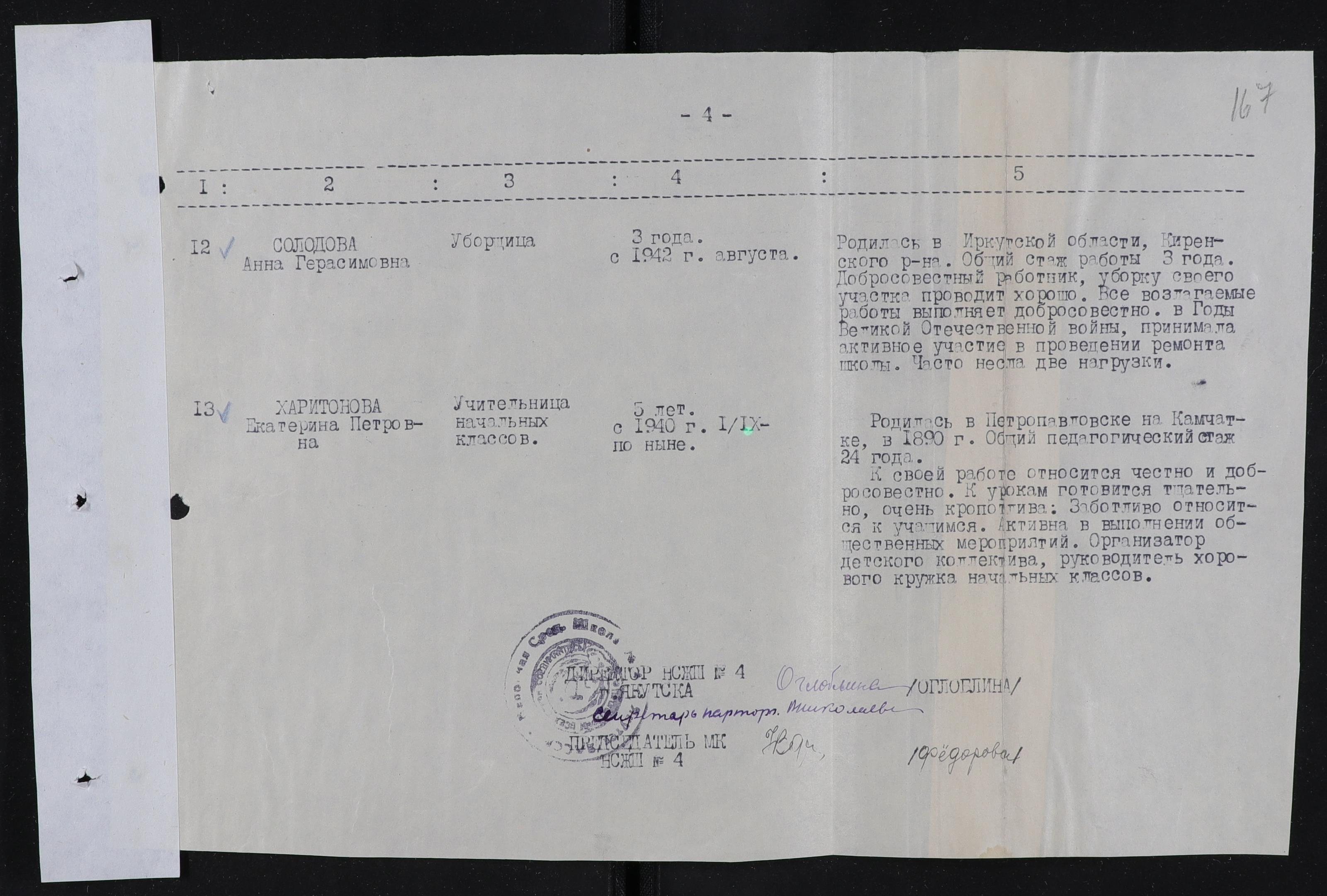 Характеристика: Родилась в Иркутской области, Киренского р-на. Общий пед.стаж - 3 года. Добросовестный работник, уборку своего участка проводит хорошо. Все возлагаемые работы выполняет добросовестно. В годы ВОВ принимала участие в проведении ремонта школы.Часто несла две нагрузки.