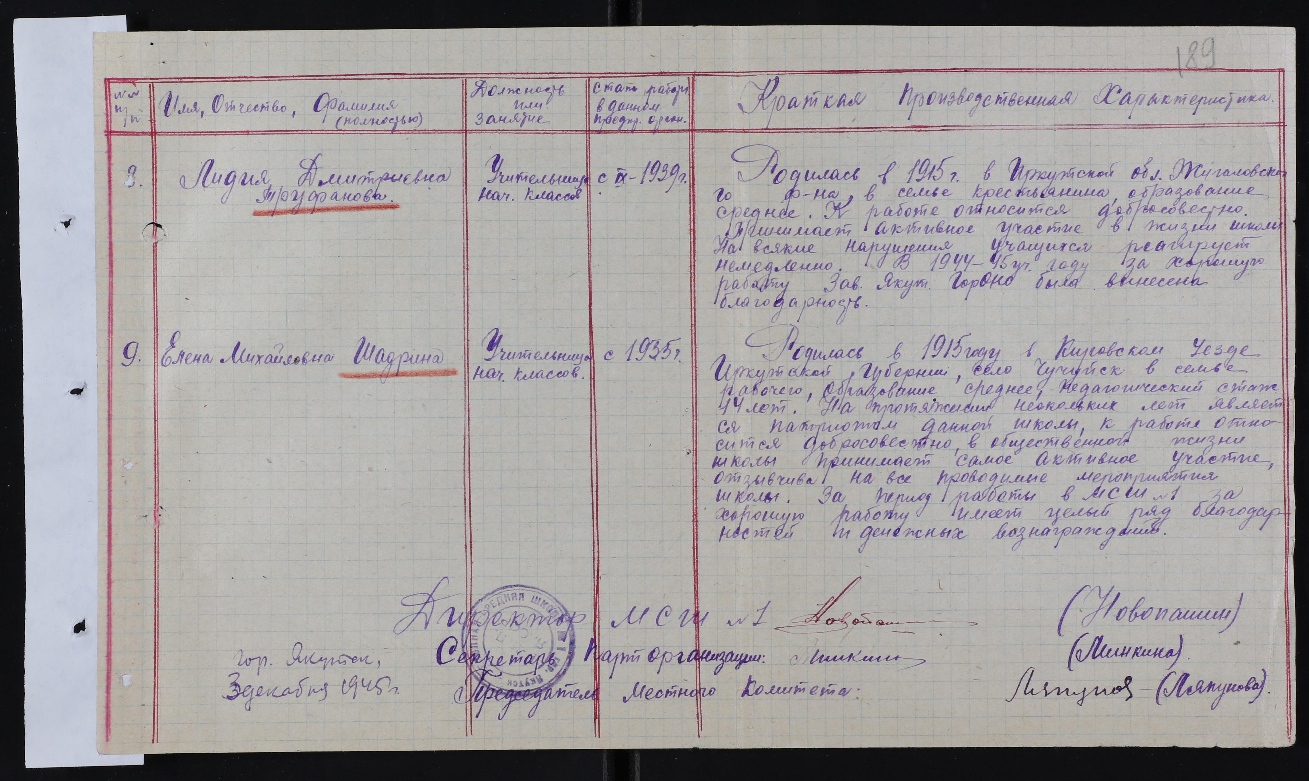 Характеристика: Родилась в 1915г. В Иркутской области, Жигаловского р-на, в семье крестьянина, образование среднее. К работе относится добросовестно. Принимает активное участие в жизни школы. На всякие нарушения учащихся реагирует немедленно. В 1944-45 уч.году за хорошую работу Зав.Якут. ГорОНО была вынесена благодарность.