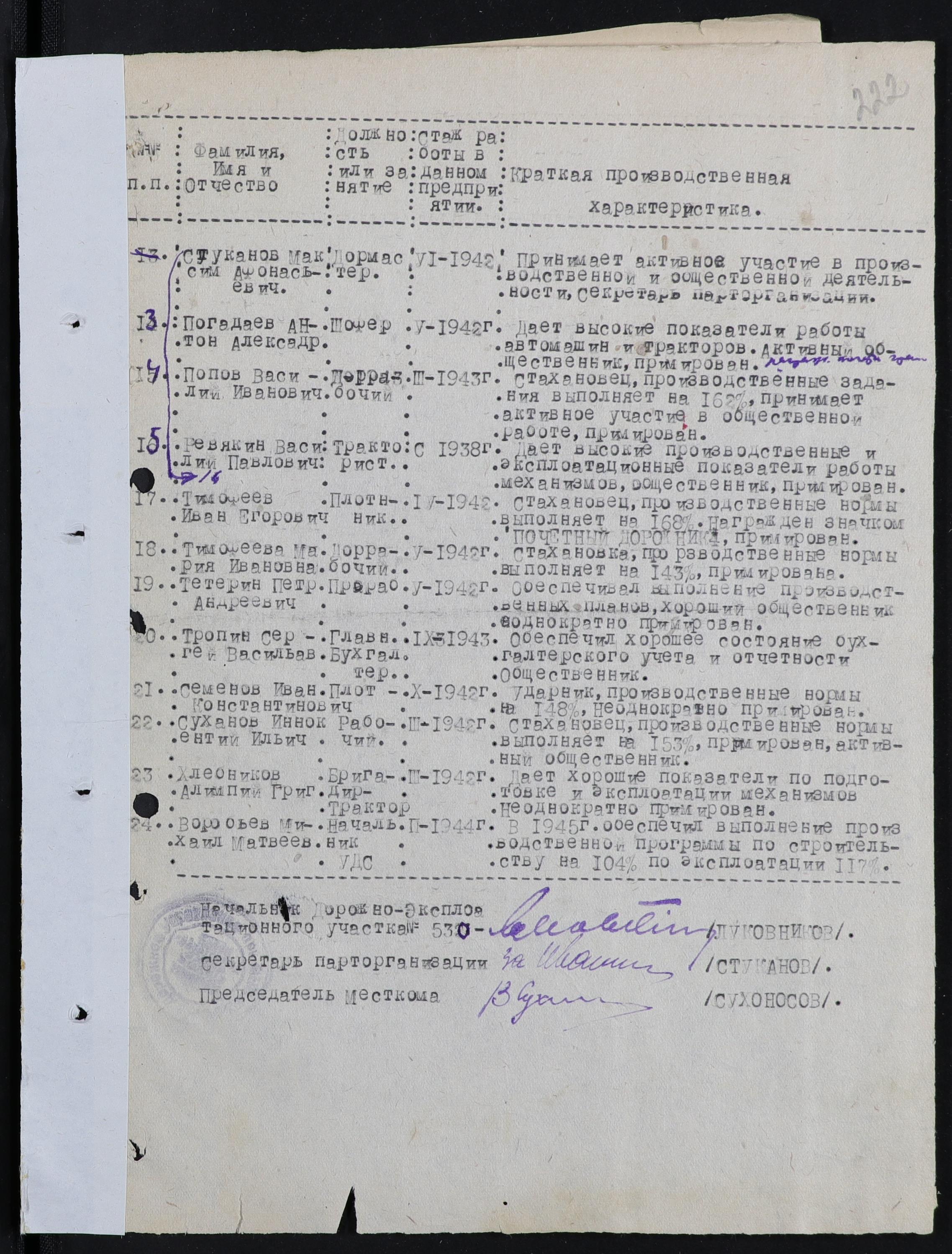 Характеристика: В 1945 году обеспечил выполнение производственной программы по строительству на 104%, по эксплуатации 117%.